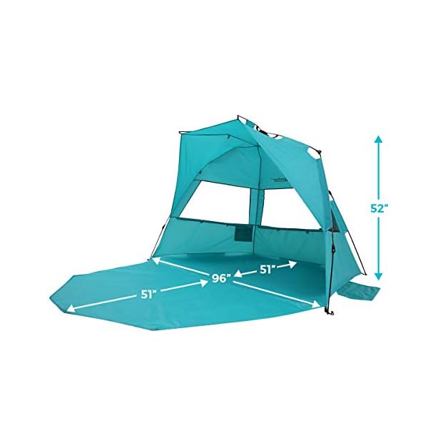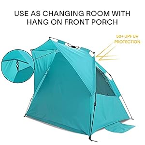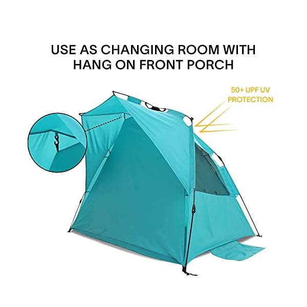 ☀INNOVATIVE DESIGN: 50+ UPF UV protection and water resistant fabric for walls and floor. 3 side roll up mesh window provides excellent ventilation. Includes 3 sand pockets, 4 stakes and extra 4 sand bags. This pop-up beach sun shelter is windproof up to 25 mph.