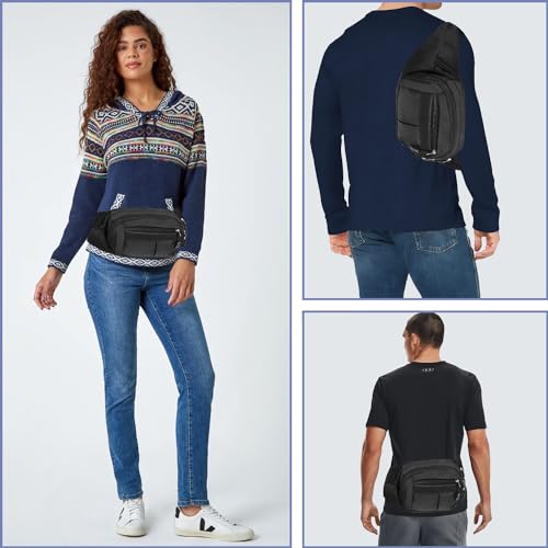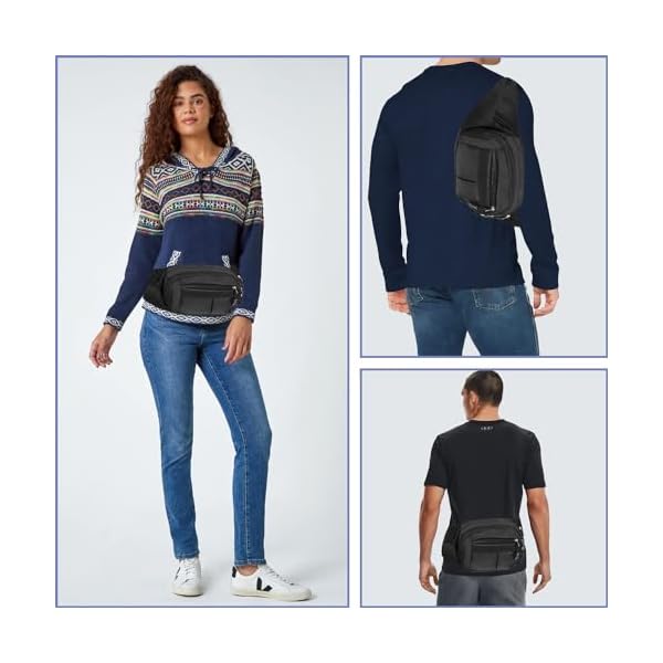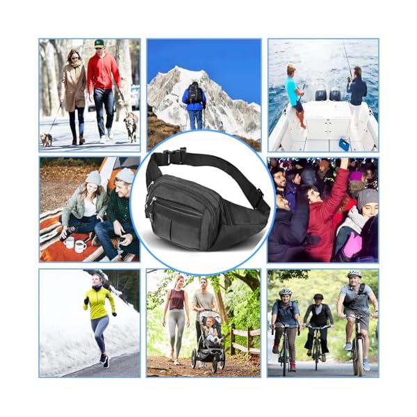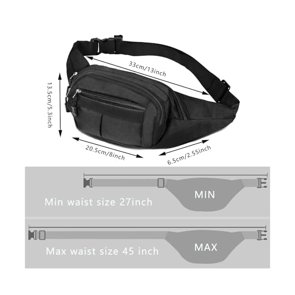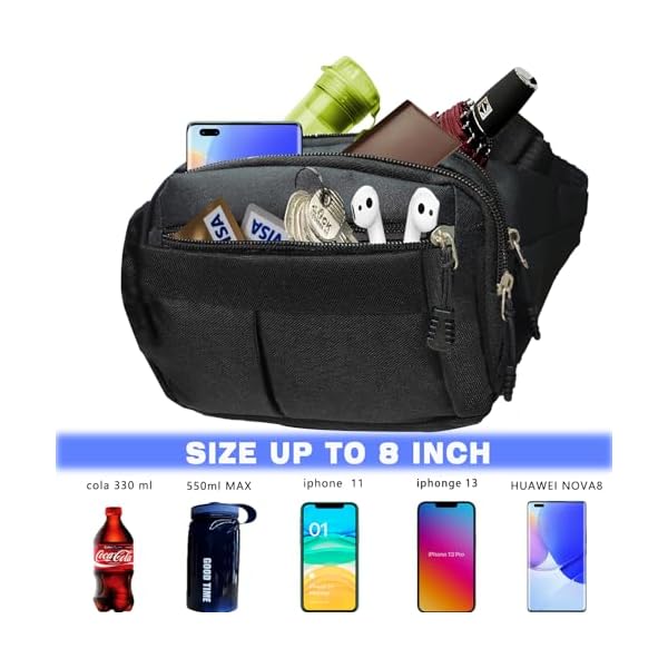 【Large capacity with 4 pockets】Our fanny pack has 4 independent zippered pockets with a large capacity: 1. The main pocket is the largest pocket that can hold 550ml water bottles and umbrellas; 2. The second one pocket has a large storage space that can accommodate phones, money, or other items; 3. The front pocket can store cards, keys, tissues, dog toilet bags, and the like; The rear zipper pocket is perfect for storing important items and bettering safety.