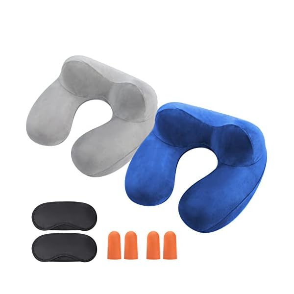 Diyauder Inflatable Travel Pillow, 2 Sets Neck Pillow for Travel, Soft Velvet Washable Pillowcase with Ear Plug/Eye Mas/Bag, Blow Up Pillow, Airplane Pillow Idea for Travel,Train,Car,Office