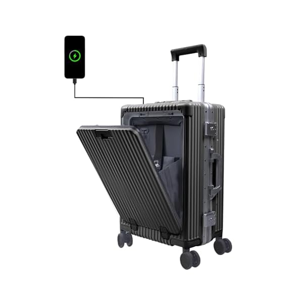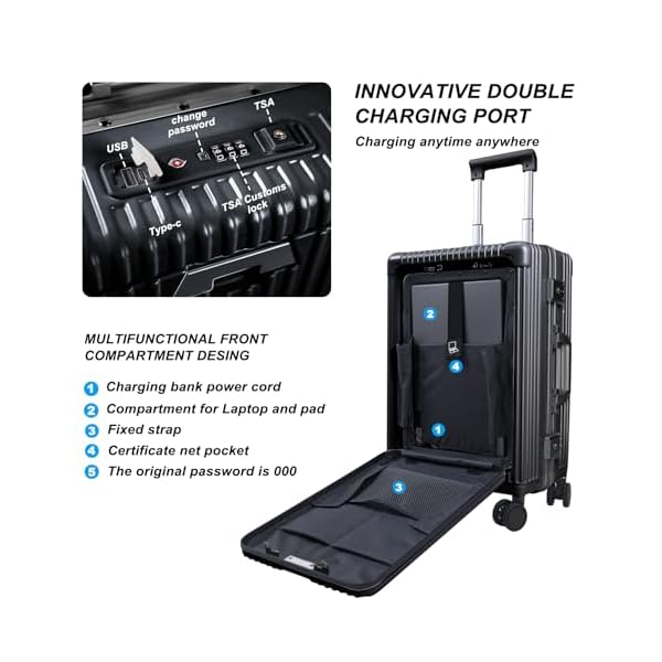 【USB+TYPE C】The carry on luggage comes with a USB port and a Type-C port which are located on the outside of the hard shell suitcases. The USB port helps to charge your mobile phone/3C carry-on, but you will need to prepare a mobile power source yourself, there is no power source in the luggage. Multi-stage telescoping handle with push button mechanism. Top and side Aluminum carry handles provide easy lifting and carrying.