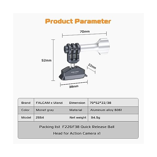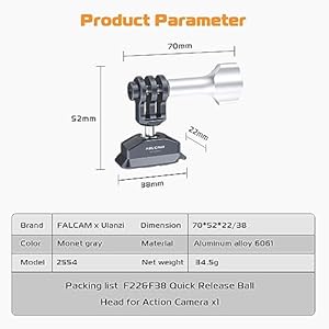 Seamless Switching: The quick release ball head plate for action camera have both F22 and F38 interface. It means you’ll use the plate to use with a variety of easy-to-use and easy-to-integrate accessories in the F22 and F38 QR ecosystem. Simply push to install and press to release for seamless transitions.