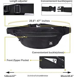 【Large Capacity】This large bumbag has three pockets: front and back zipper pockets, and one large main pocket. The front zipper pocket can hold small objects for easy access. The main pocket can hold mobile phone, wallet, money, passport, keys, charging treasure and so on. The back zipper pocket can be used for cell phone, cash and other valuables. This is a good belt bag for keeping your belongings close and safe.