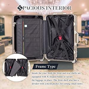 Aluminum frame + Alumium corner pad | Aluminum assists in keeping the luggage frame from bending, giving the luggage a longer lifecycle. The Alumium durable corner pads at the edges give protection to the luggage from shock and damage as well.