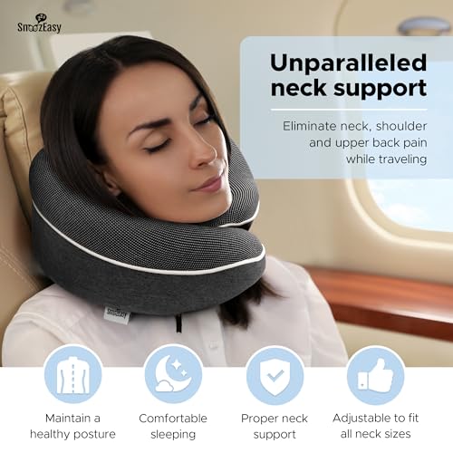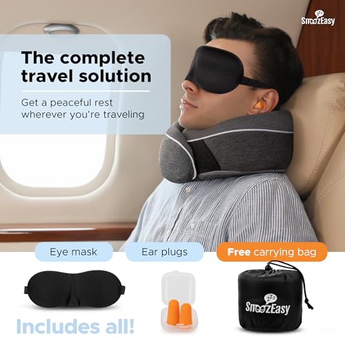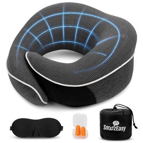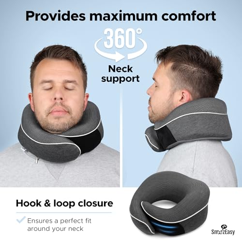 SnoozEasy™ Travel Pillow for Adults | Memory Foam 360 Degree Neck Support with Removable Pillow Case | Includes Travel Bag, Eye Mask and Ear Plugs | Dark Grey | UK Brand
