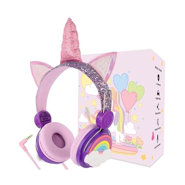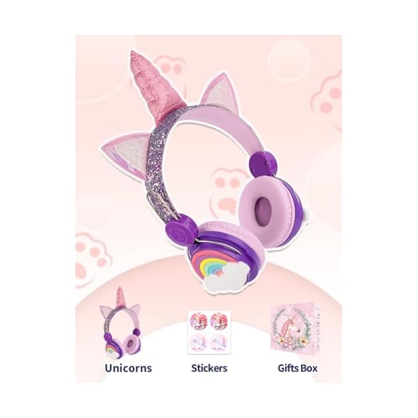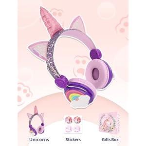 Unicorns gifts for girls:Glitter Unicorns headphones with sparkly material, come with unicorns gifts box,Unicorns bracelet,unicorns stickers.