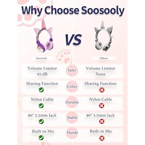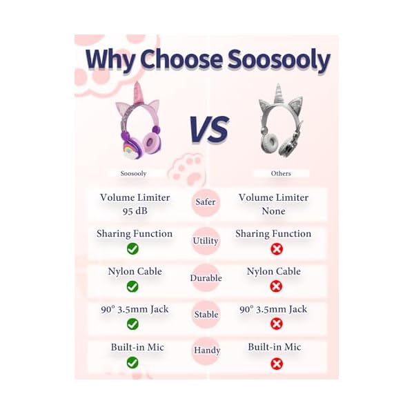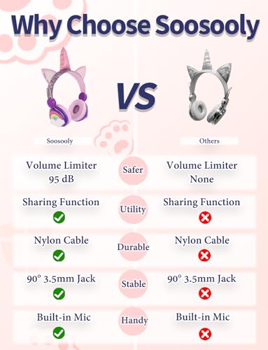 【Unicorn Design】:Age Grading:Over 3 years old.many girls like Unicorn headphones, so buying Soosooly headphones is a choice that Unicorn lovers can’t miss. This girl’s headphones, combined with glittering materials and a comfortable headphones, will provide each and every child with a fashionable wearing and comfortable listening experience.