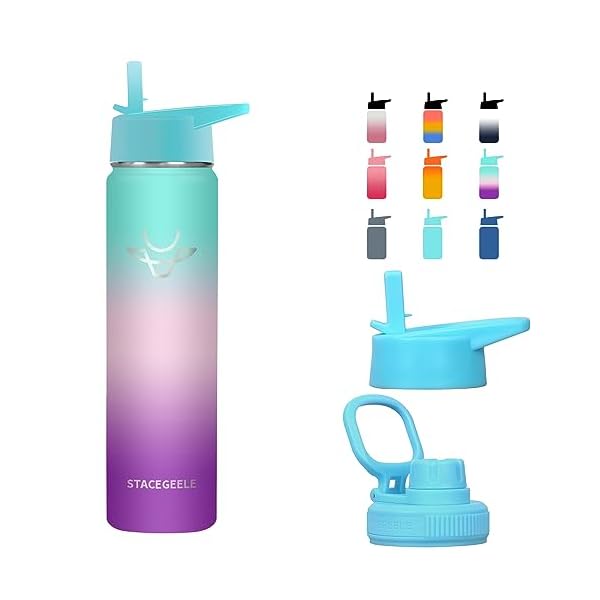STACEGEELE Insulated Vacuum Water Bottle with Straw Lid Stainless Steel Flask Thermos Leak Proof Lightweight Eco Friendly 24oz